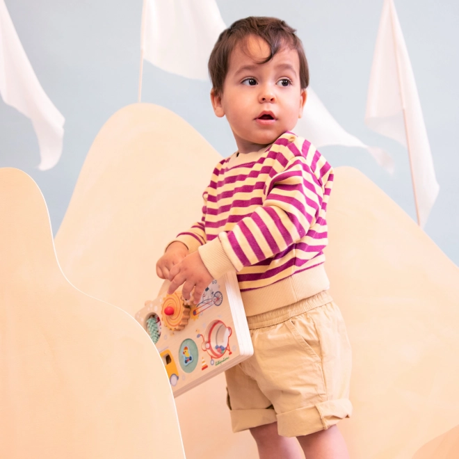 Panel nabízí nepřeberné množství interaktivních aktivit ve tvaru kufříku, které udržují děti zabavené a podněcují jejich zvědavost.