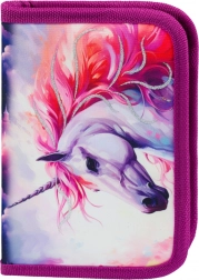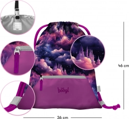 Součástí setu je klasický jednopatrový penál se dvěma chlopněmi, uzavíratelný kvalitním zipem YKK (bez náplně), a odolný sáček s kapsou na zip, který lze pomocí karabinky připnout přímo na aktovku. Zdrhování pevnými tkanicemi umožňuje pohodlné nošení na zádech.