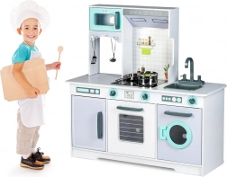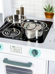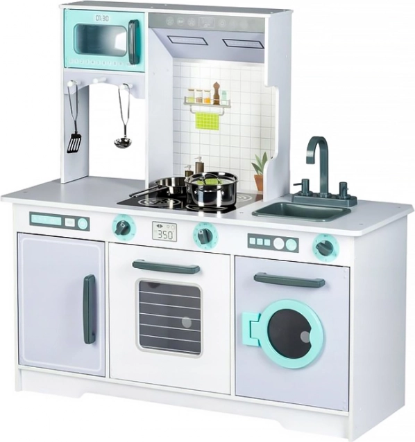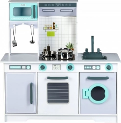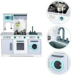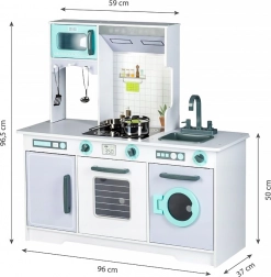 Tato stylová dětská kuchyňka v bílo‑tyrkysové kombinaci vytvoří doma opravdové kulinářské studio. Díky množství interaktivních prvků – od otáčecích knoflíků s klikacím efektem až po otevírací dvířka u trouby, mikrovlnky, myčky i pračky – děti zažijí autentickou hru na vaření a péči o domácnost.