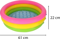 Udělejte dětem radost bazénkem, který je jako stvořený pro horké dny. Kompaktní rozměry 61 × 22 cm, tři samostatně nafukovací kruhy v duhových barvách a nafukovací dno pro větší pohodlí dělají z tohoto modelu skvělou volbu pro nejmenší.