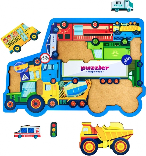 Dřevěné puzzle s tématem dopravy přináší dětem hravou formou učení. Každý z 18 dílků představuje samostatné vozidlo nebo dopravní značku, díky čemuž si děti procvičí rozpoznávání tvarů, slovní zásobu a trpělivost. Pevné dřevěné provedení zaručuje dlouhou životnost a bezpečnou manipulaci malých ručiček.