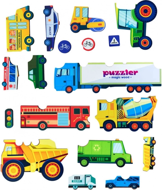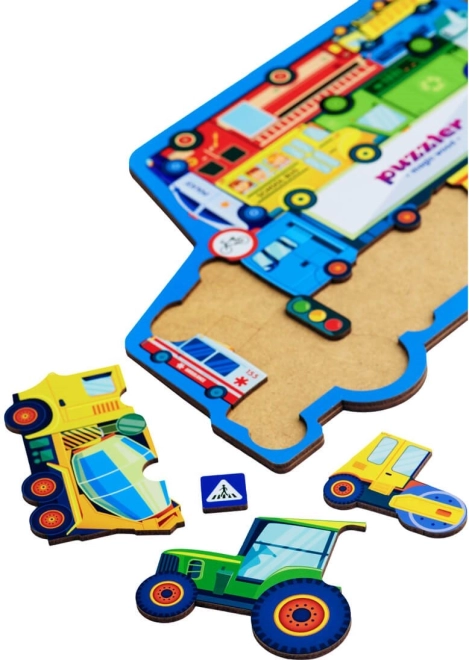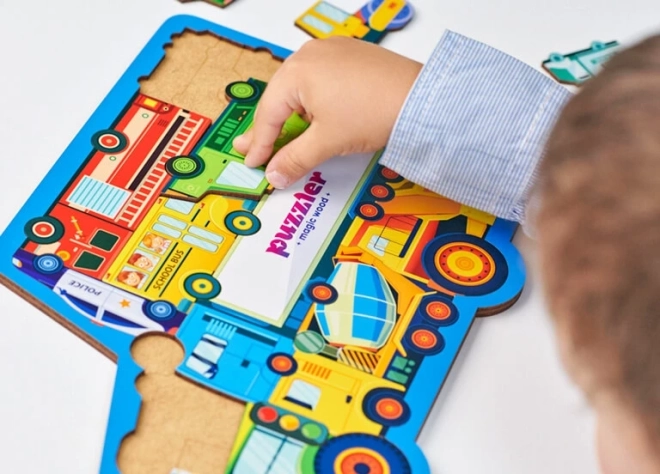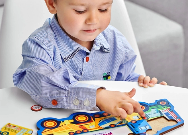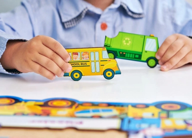 Každý dílek zobrazuje jiný dopravní prostředek nebo značku, takže si děti snadno osvojí nové pojmy a rozšíří slovní zásobu.