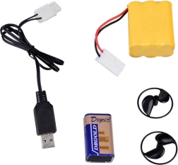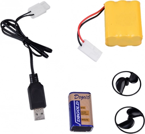 Součástí je akumulátor 7,2 V, 9V baterie do ovladače, USB nabíjecí kabel, náhradní vrtule a praktický stojánek.
