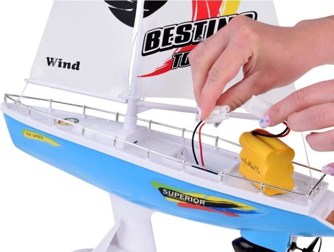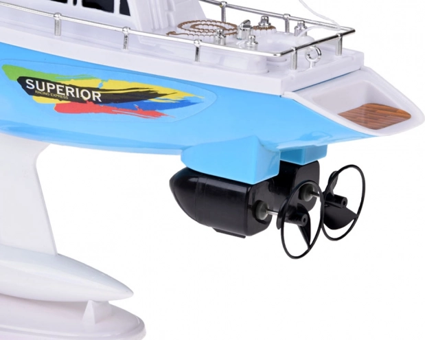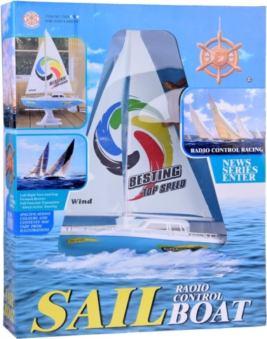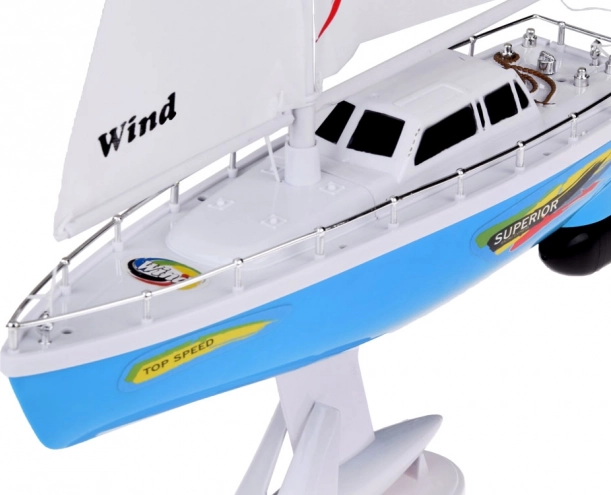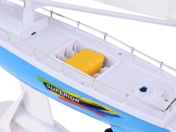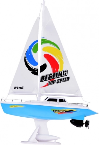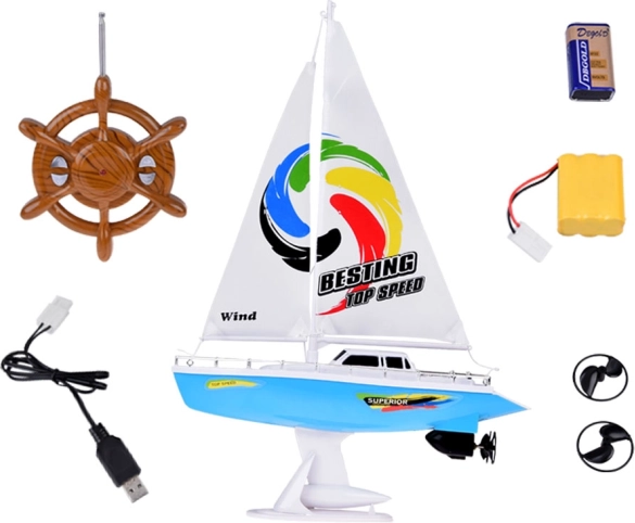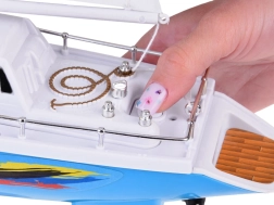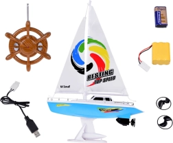 Stylová RC plachetnice v modro‑bílé barvě s realistickými plachtami přináší dětem spoustu zábavy na vodě. Ovládání zajišťuje volantový ovladač na frekvenci 27 MHz, nechybí dvojité lodní šrouby, stabilizační kýl, chromované relingy a stojánek pro vystavení. Součástí balení je nabíjecí akumulátor, USB kabel a náhradní vrtule.