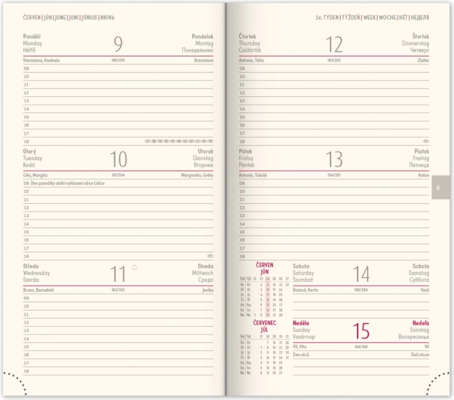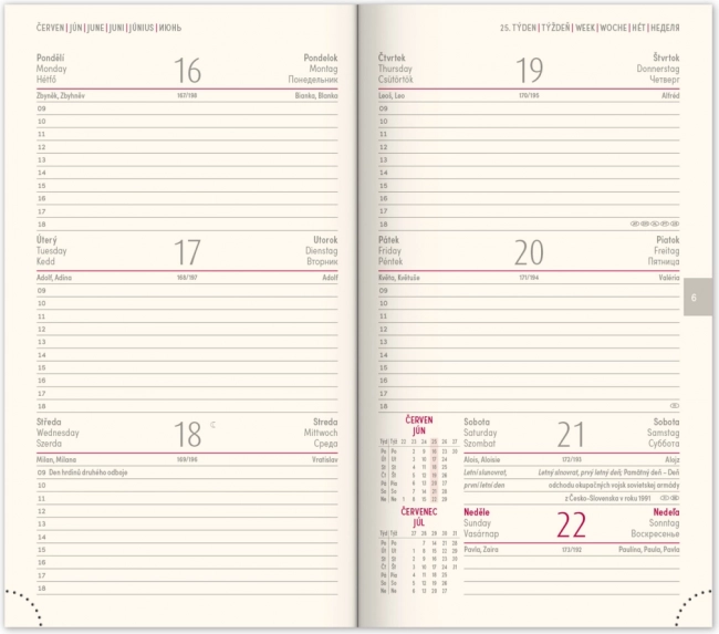 • Týdenní rozvrh s česko-slovenským kalendáriem a doplňkovými jazyky.