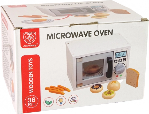 Stylová dřevěná mikrovlnka v bílé barvě je perfektní doplněk do každé dětské kuchyňky. Podporuje hru na role, má magnetická dvířka, klikací otočný knoflík a přichází s bohatým příslušenstvím. Vyrobena z kvalitního dřeva a bezpečně lakovaná podle norem CE a EN 71, vhodná pro děti od 3 let.