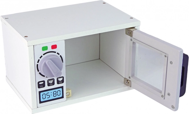 Tato dřevěná dětská mikrovlnka přináší realistické detaily, které děti milují: otočný knoflík s příjemným klikáním, potisk s displejem a časem ohřevu a dvířka na magnet pro snadné a bezpečné zavírání. Díky kompaktním rozměrům se skvěle hodí do dětských koutků a kuchyněk.