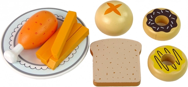 - Bohaté příslušenství: talíř, 2× donut, houska, krajíc chleba, 4× hranolky, kuřecí stehno
