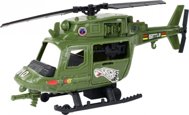 Zelený bojový vrtulník s průhledným kokpitem a detailními potisky přináší do hry akci a realismus. Světelné a zvukové efekty podpoří atmosféru každé mise.