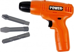 Lehká plastová vrtačka s výměnnými vrtáky padne do malé ruky a podporuje nácvik šroubování a montáže. Ideální pro role-play malých kutilů.