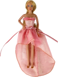 Panenka s dlouhými blond vlasy a modrýma očima, oblečená v růžových šatech s nadýchaným topem a mašlí.