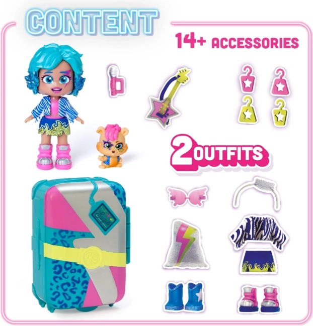 - Exkluzivní panenka, 2× obleček, 1× zvířátko, více než 13 doplňků, ramínka, přenosný kufřík
