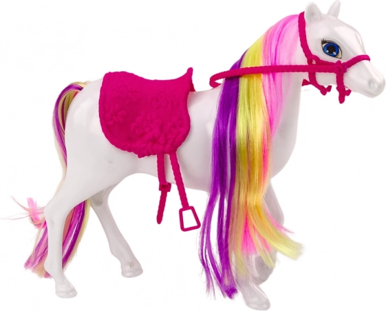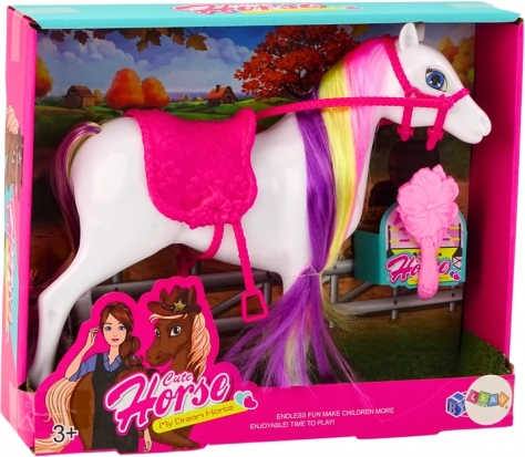 Objevte kouzlo jezdeckého světa s figurkou bílého koně, která nadchne detailním provedením a doplňky. Děti mohou vytvářet kreativní účesy pomocí přiloženého kartáče a doplnit hru o nastavitelné růžové sedlo a uzdečku. Hračka je skvělá pro rozvoj jemné motoriky, představivosti a pečujících dovedností.