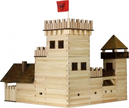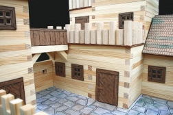 Dřevěné hranolky 9×9 mm a papírové doplňky (okna, dveře, střechy) zajišťují věrný vzhled středověké architektury.