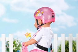 Tato růžová třpytivá helma s hravými samolepkami a logem BABY born je skvělým doplňkem pro realistické hry na kolo či brusle. Díky pevnému plastovému skeletu a ventilaci pomáhá chránit hlavičku panenky a zároveň zajišťuje komfort při „jízdě“.