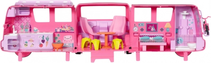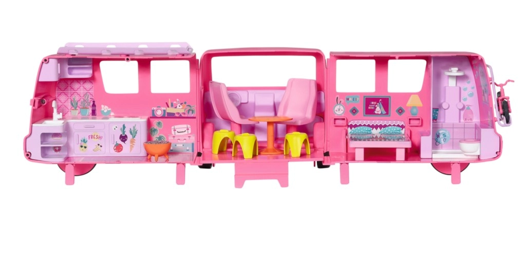 Set Baby Born Minis přináší dětem nekonečné možnosti hry na cestování a kempování. Růžový karavan se po otevření promění v útulný domeček na kolech s detailně zpracovanou kuchyňkou, jídelním koutem, místem na spaní a koupelnou se sprchou. Díky pestrým doplňkům si děti mohou vytvářet své vlastní příběhy – od ranní snídaně až po večerní grilování.