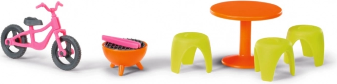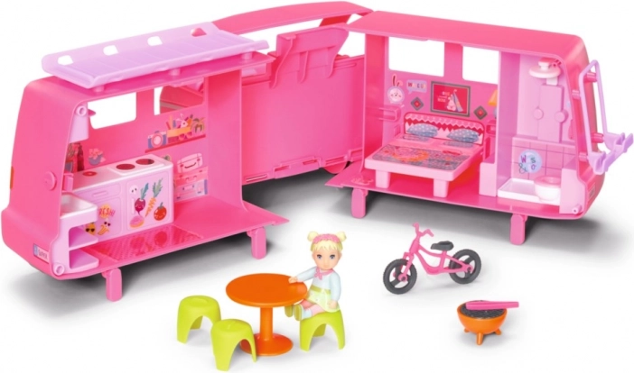 - Rozkládací karavan, panenka Jasmin, kolo, gril s kleštěmi, kulatý stůl, 3 židličky, další drobné doplňky