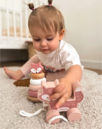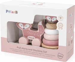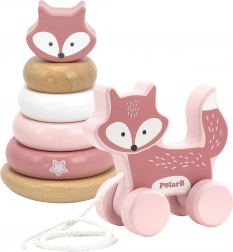 V této sadě najdete dvě oblíbené hračky: stohovací věž s liškou, která učí děti skládat kroužky podle velikosti a barev, a tahací lišku na provázku, jež motivuje k chůzi a zábavnému pohybu. Kombinace obou podporuje přirozené učení formou hry.