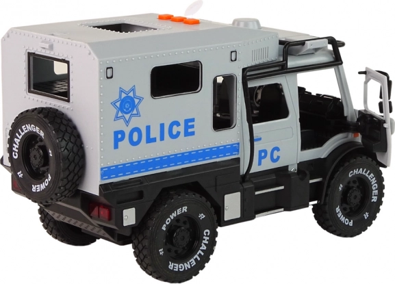 Díky otevíracím předním dveřím mohou děti prozkoumávat interiér vozu a vytvářet vlastní scénáře. Zvukové a světelné efekty přidávají na vzrušení! LED světla na přední části vozidla se rozsvítí po stisknutí jednoho ze tří tlačítek na střeše, zvuky alarmu dodají realistického nádechu.