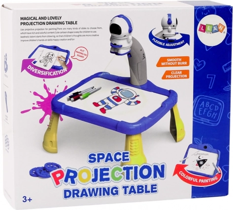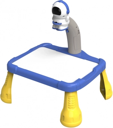Projektor je ve tvaru kosmonauta a slouží k promítání obrázků na papír, což dětem umožňuje snadno sledovat a kreslit kosmické motivy jako planety, hvězdy, rakety a kosmonauty. Stolek je vybaven stabilními žlutými nohami a modrým prostorným povrchem pro kreslení.