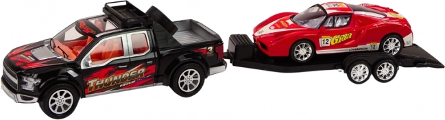 Dynamický hrací set pro malé řidiče: robustní pickup s přívěsem a červeným sporťákem pro nekonečné scénáře přepravy. Nechybí pohon na setrvačník, odpojitelný přívěs, realistické detaily a možnost samostatné hry s oběma vozy. Certifikace CE, norma EN71, pro děti od 3 let.