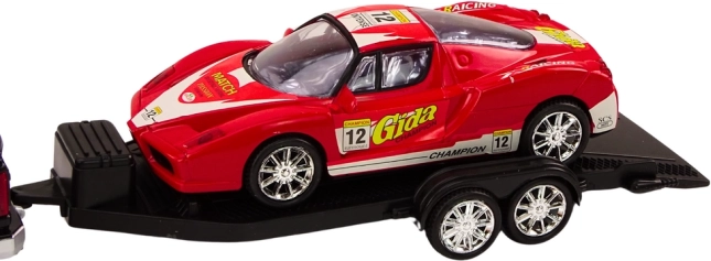 Pickup s velkými černými koly spolehlivě táhne přívěs se sportovním autem a díky pohonu na setrvačník se po natažení rozjede vpřed bez baterií. Odpojitelný přívěs umožní rychle změnit hru – děti mohou převážet vůz, nebo si hrát s každým modelem zvlášť. Červené sportovní auto zaujme elegantními liniemi a lze jej snadno naložit i vyložit.