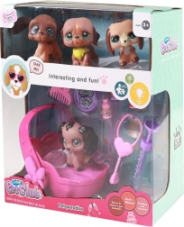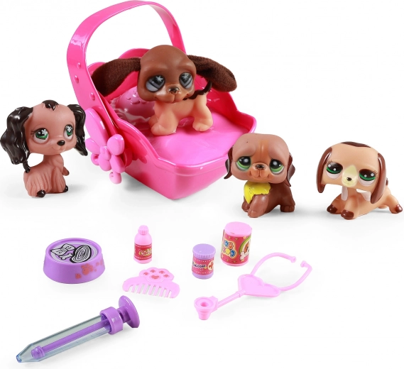 Tato rozkošná sada obsahuje čtyři různé hračky pejsků, každý s velkýma očima a hravým výrazem, který jistě okouzlí každého malého milovníka zvířat. Přenoska, která je součástí balení, nejen slouží jako pelíšek, ale také hraje a bliká červeným a modrým světlem, čímž podpoří kreativitní hru.