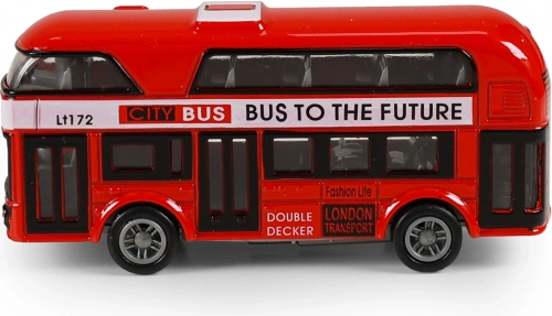 Objevte kouzlo klasických ulic Londýna s červeným dvoupatrovým autobusem v měřítku kapesní hračky. Kovové tělo doplňují plastové detaily a hladká kola, díky nimž model plynule jezdí. Mechanismus zpětného chodu zajistí, že po natažení směrem dozadu autobus sám vyrazí vpřed.