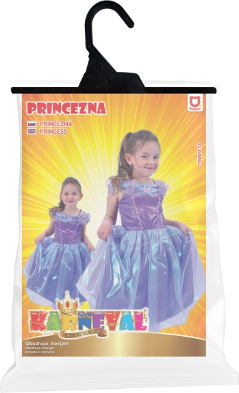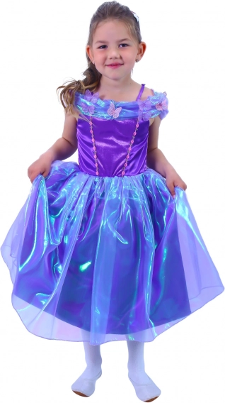 Roztočte dětskou fantazii s tímto kouzelným kostýmem princezny ve fialové barvě. Šaty mají třpytivý efekt, dekor motýlků na živůtku a bohatou vrstvenou sukni pro skutečně pohádkový vzhled. Ideální na karneval, narozeninové oslavy i domácí převlékání. Velikost M je vhodná pro děti 6–8 let (116–128 cm).