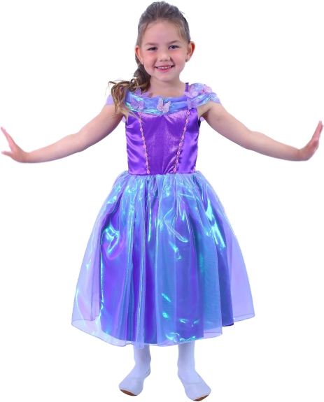 Tento fialový kostým princezny promění každou holčičku v hvězdu každé oslavy. Jemné třpytivé materiály, květinové a motýlí detaily a lehká vrstvená sukně podtrhují pohádkový vzhled, který je pohodlný na nošení po celý den.