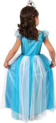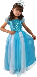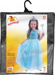 Dívčí kostým princezny v elegantní modré barvě s bílým tylem zaujme na první pohled. Horní díl zdobí modré flitry, které se krásně třpytí při každém pohybu, zatímco lehká tutu sukně dodává šatům pohádkový objem. Ideální pro karneval, maškarní bál, narozeninové oslavy i každodenní převlékací hry.