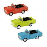 Vychutnejte si nostalgii na čtyřech kolech s ikonickým modelem TRABANT kabriolet 1:32. Kovové (die-cast) provedení, autentické detaily karoserie a interiéru a plynulá jízda na zpětný setrvačník z něj dělají skvělý dárek pro děti od 3 let i stylový sběratelský kousek.
