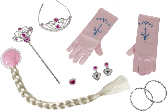 - V sadě najdete: korunku, náušnice, prstýnky, kouzelnou hůlku, náramky, rukavice a dlouhý blond cop