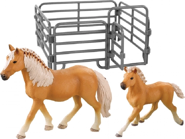 Tato sada dvou figurkových koní, včetně koně a hříběte, je ideální pro všechny mladé fanoušky koní. Každá figurka je detailně zpracována s hnědou barvou a světlou hřívou, což přidává na autentičnosti a realističnosti. Součástí balení je i ohrada, která umožňuje dětem vytvářet své vlastní farmářské scénáře.