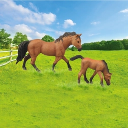 Tato sada obsahuje dva plastové koně - dospělého koně a hříbě, ideální pro vzdělávací a dekorativní účely.