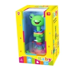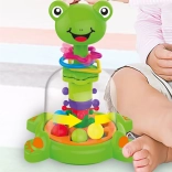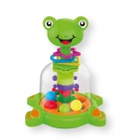 Tento žabí kolotoč s kuličkami je ideální první interaktivní hračka pro nejmenší. Jednoduchým stiskem hlavy žáby se spustí rotace, kuličky se roztočí, poskakují a vytvářejí zábavný chrastící efekt, který podněcuje zrak i sluch dítěte.