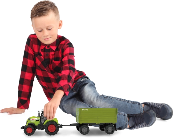 Objevte realistickou farmářskou zábavu s kompaktním traktorem s vlečkou, který je ideální do dětských ručiček. Vlečka jde snadno odpojit i otevřít, takže přeprava "nákladu" je hračka. Díky volnoběhu se traktor snadno ovládá a hladce jezdí po rovných plochách.