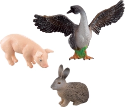 Obsahuje tři realistické plastové figurky: sele, králíček a husa s roztaženými křídly, vyrobené v přírodních barvách.