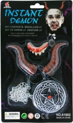 Tato kompletní sada ďábelských doplňků promění každý outfit během chvilky. Komfortní rohy na gumičce skvěle drží, výrazný náhrdelník s pentagramem dotvoří mystický look a realistické upíří zuby dodají kostýmu temnou jiskru.