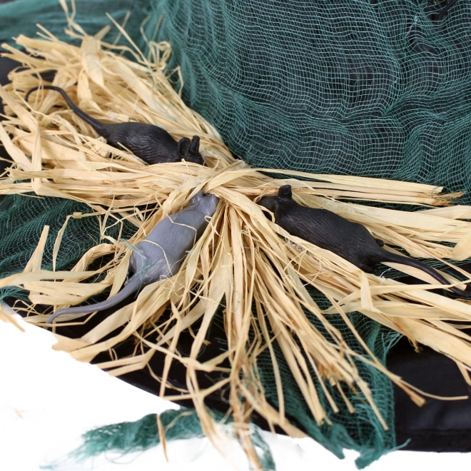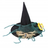 Klobouk je zdoben zelenou gázou a pavoučky, což dodává strašidelný a zároveň stylový vzhled.