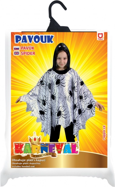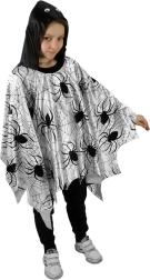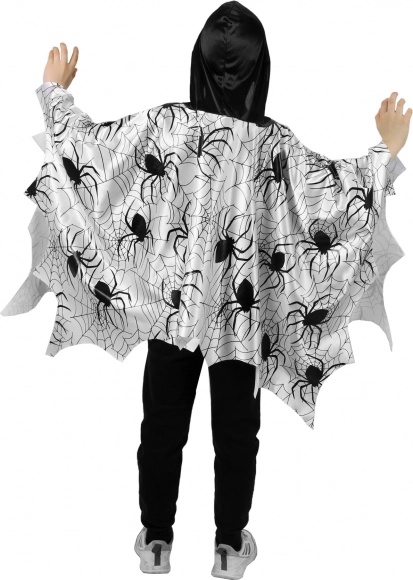 Hledáte snadný a efektní kostým pro děti? Tento lehký plášť/pončo s černým potiskem pavouků a pavučin na bílém podkladu zaujme na první pohled. Díky volnému střihu se pohodlně obléká přes hlavu a umožňuje neomezený pohyb při hrách, tanci i průvodech.