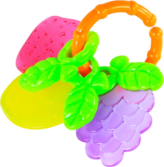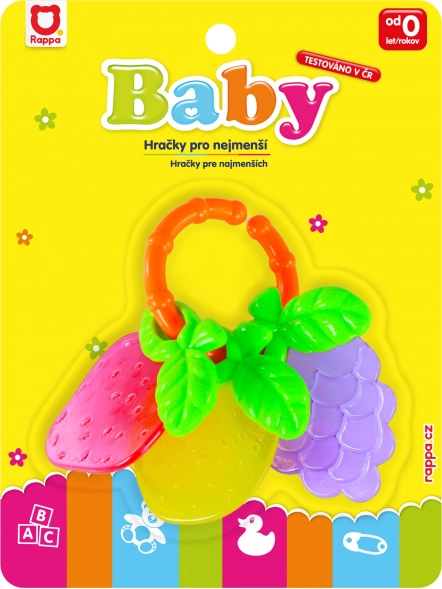 Hravé chrastítko/kousátko s ovocnými motivy zaujme děti pestrými barvami a příjemnou texturou, která masíruje dásně a pomáhá při prořezávání zoubků. Praktický tvar podporuje přirozený úchop a rozvoj jemné motoriky.