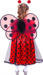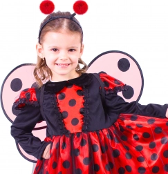 Kostým dokonale napodobuje berušku díky červeným šatům s černými puntíky, křídlům a čelence s tykadly.