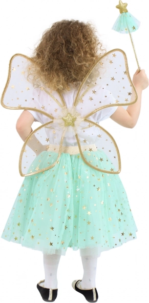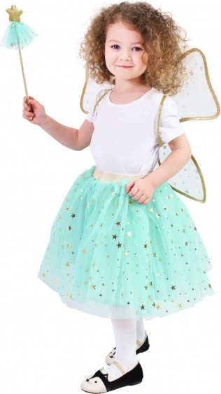 Kostým obsahuje nádhernou zelenou sukýnku se zlatými hvězdičkami, doplněnou sladěnými křídly a hůlkou pro dokonalý pohádkový zážitek.