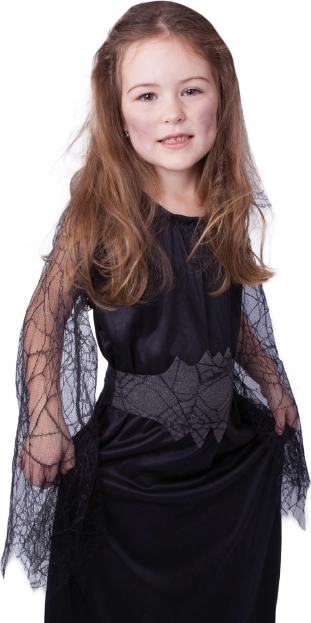Tento dětský kostým černé čarodějnice promění každou holčičku v opravdovou kouzelnici. Šaty v univerzální černé barvě zdobí jemně průhledné rukávy s pavučinovým motivem, které dodají outfitu tajemný nádech. Velikost S je ideální pro děti ve věku 4–6 let a výšce 105–116 cm.