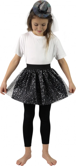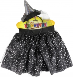 Tento půvabný čarodějnický set promění každou holčičku během chvilky v malou kouzelnici. Tutu sukně má černou spodničku a vzdušný tyl s třpytivým potiskem stříbrných hvězdiček, díky kterému krásně vynikne při pohybu i na fotkách. Čelenka s mini kloboučkem outfit stylově doplní a dodá mu hravý, pohádkový nádech.