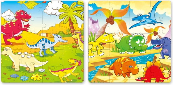 Děti si užijí hned dvě barevné dinosaurí ilustrace – každá složená z 20 pevných dílků pro dlouhou zábavu.