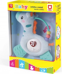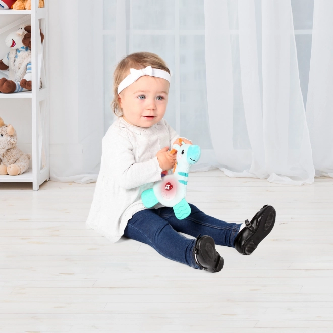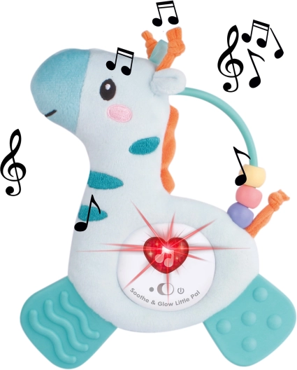Plyšová žirafa je navržena tak, aby zaujala svými pestrými barvami a zábavnými zvuky, které se aktivují při stisknutí. Tato hračka je ideální společník pro dětskou hru i zklidnění.