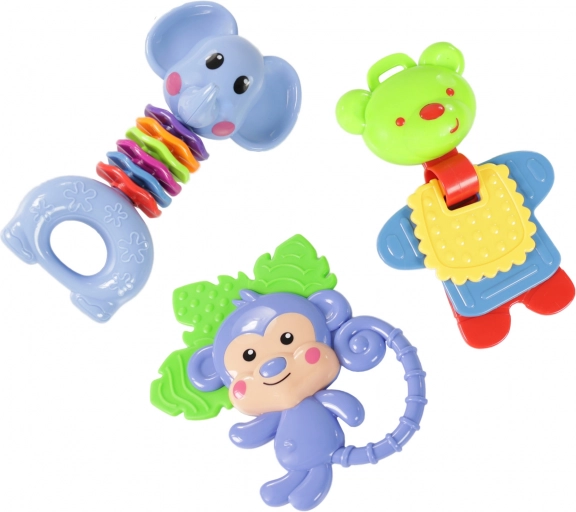 Zvířátková chrastítka přitahují pozornost dítěte jasnými barvami a zajímavými tvary, což podporuje vizuální rozvoj.