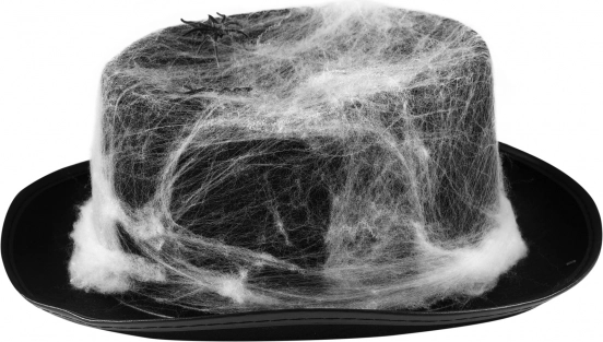 Bílá umělá pavučina na černém klobouku vytváří výrazný kontrast a působí realisticky – ideální pro Halloween a hororové motivy.
